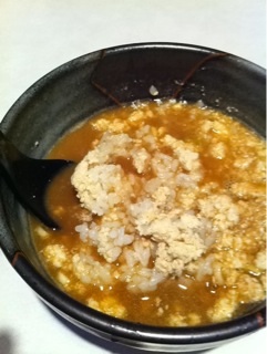 麺を食べ終わったら、スープ割(出汁)で程良く薄めたつけつゆに『そぼろ〆めし』をドボン!