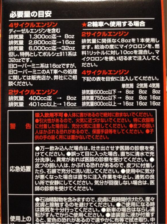 とりあえず今回は小缶8ozにしたのですが、余ればガソリンタンクに入れて燃料添加剤として使えるというスグレモノなので、次回は大缶(16oz)にしよう。